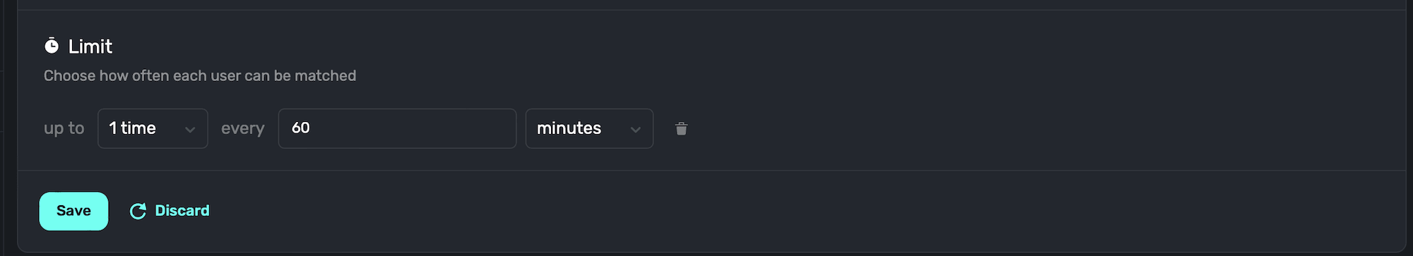 This is useful if you want to limit how many times a user can match with the audience. You can choose how many times the limit should be placed, along with a time duration and time span. For example: 1 (times) every 60 (time duration) minutes (time span):