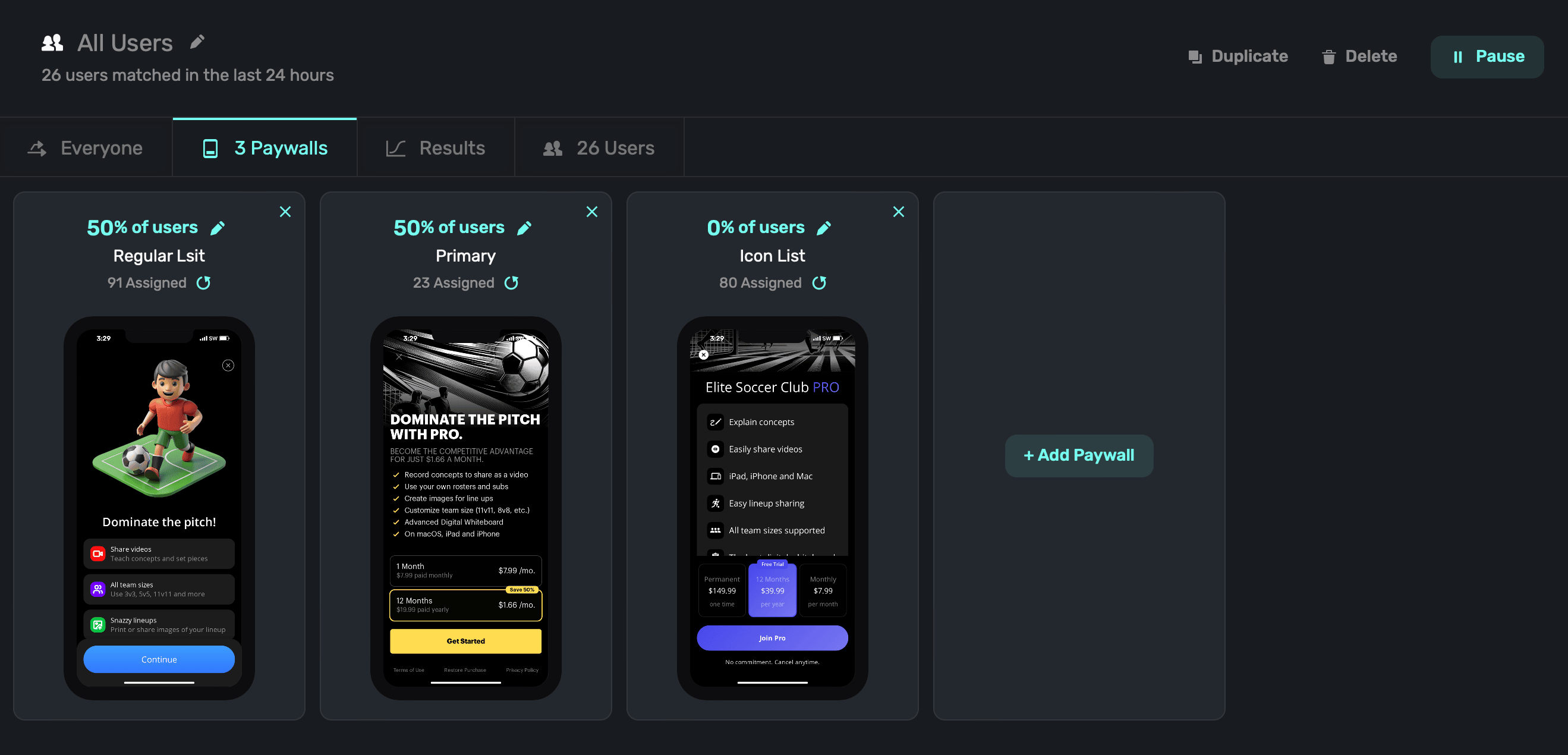 You can add new paywalls for the audience to use, or set a percentage to show across multiple paywalls when the audience is matched. To add a new paywall, click on + Add Paywall to associate one to the current campaign.