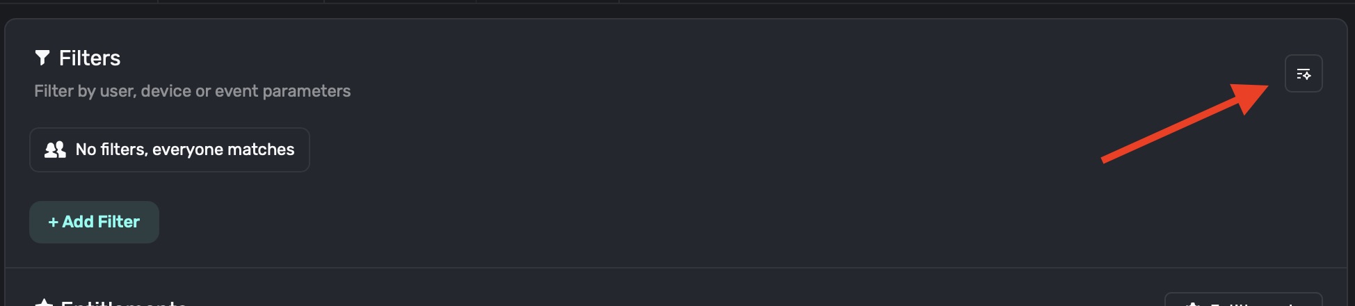 To use an audience to filter for a particular set of events, rules or any other condition — you use filters, specify if an entitlement should be evaluated, along with an optional limit.
