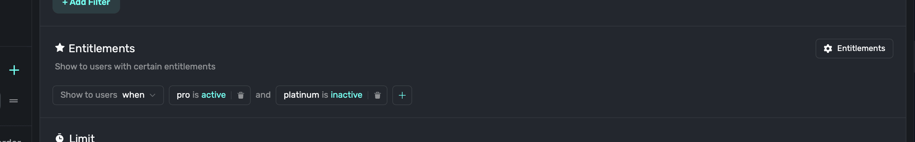 To set a limit for an audience, click the + Add Limit button — located below the entitlements section:
