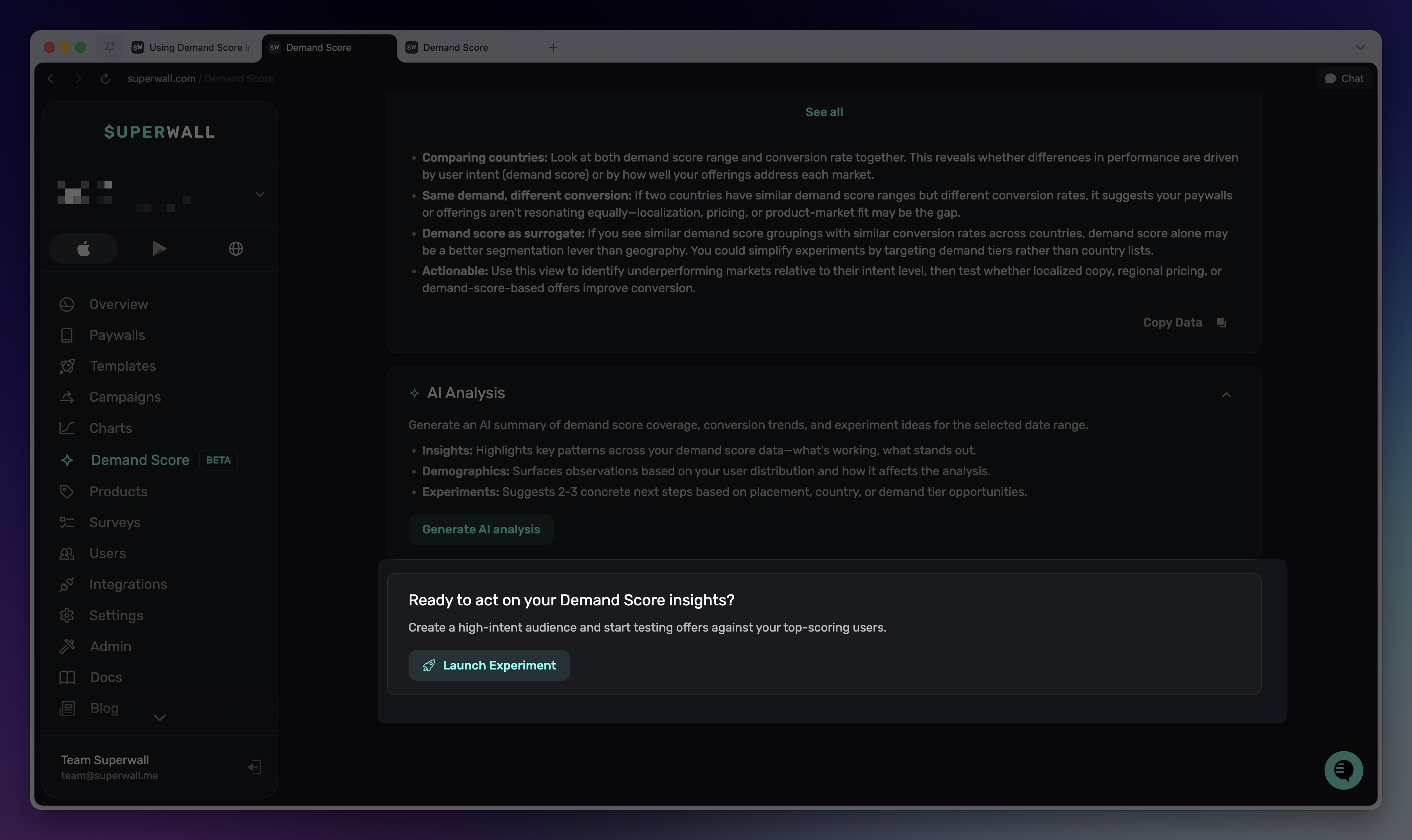 Once you understand your demand score distribution, you can act on it by creating targeted audiences in your campaigns. Superwall provides a quick-start flow and manual options for building demand-score-based experiments.